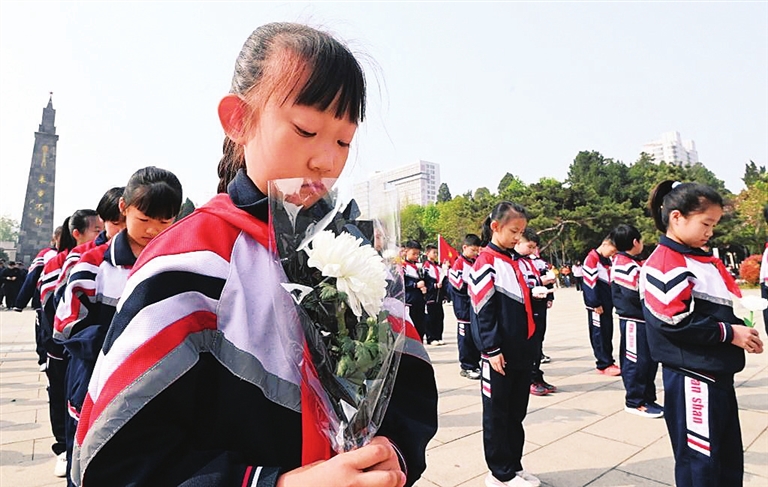 4月4日,湖南芷江居民曾星华带着读初中的女儿曾一可来到英雄广场烈士陵园。曾星华说,家风家教的核心是教孩子做人。在清明假期带孩子来陵园祭奠烈士,就是希望女儿能学习先辈的勇敢,也懂得敬畏与感恩。