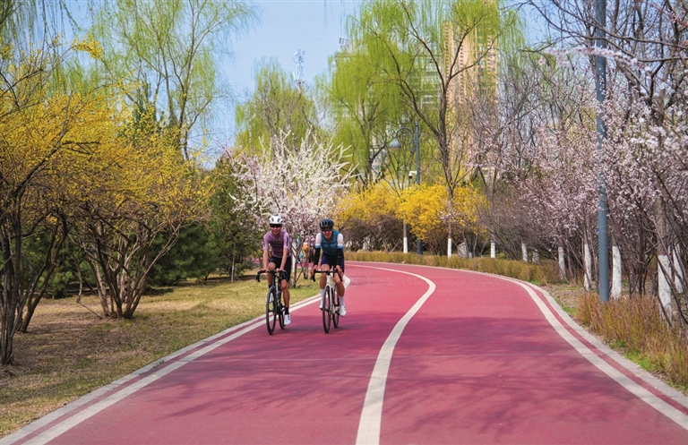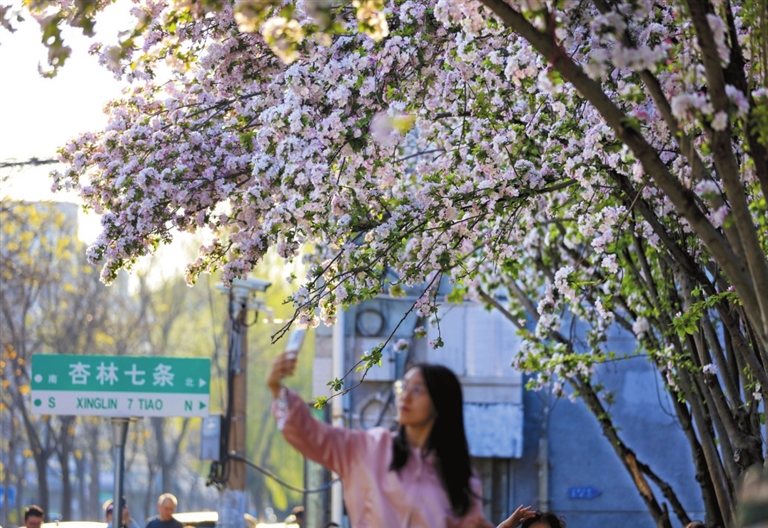 沿汾河岸畔前行,那条红色的自行车道串联起流动的春景。骑行其间,一侧是碧波荡漾的汾水,一侧是灿烂如金的连翘与粉艳的桃花。春风拂面,花香扑鼻,路在景中、景随车行的惬意油然而生。转角处,正对着山西博物院的下穿通道旁,杏花如云似雾,为往来的行人织就一条浪漫的花路。