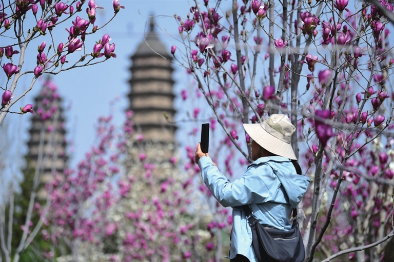 双塔公园,巍峨的凌霄塔下,桃花开得正艳,历史的厚重与春日的娇嫩在此刻交织,勾勒出“古建寻芳”的独特意境。