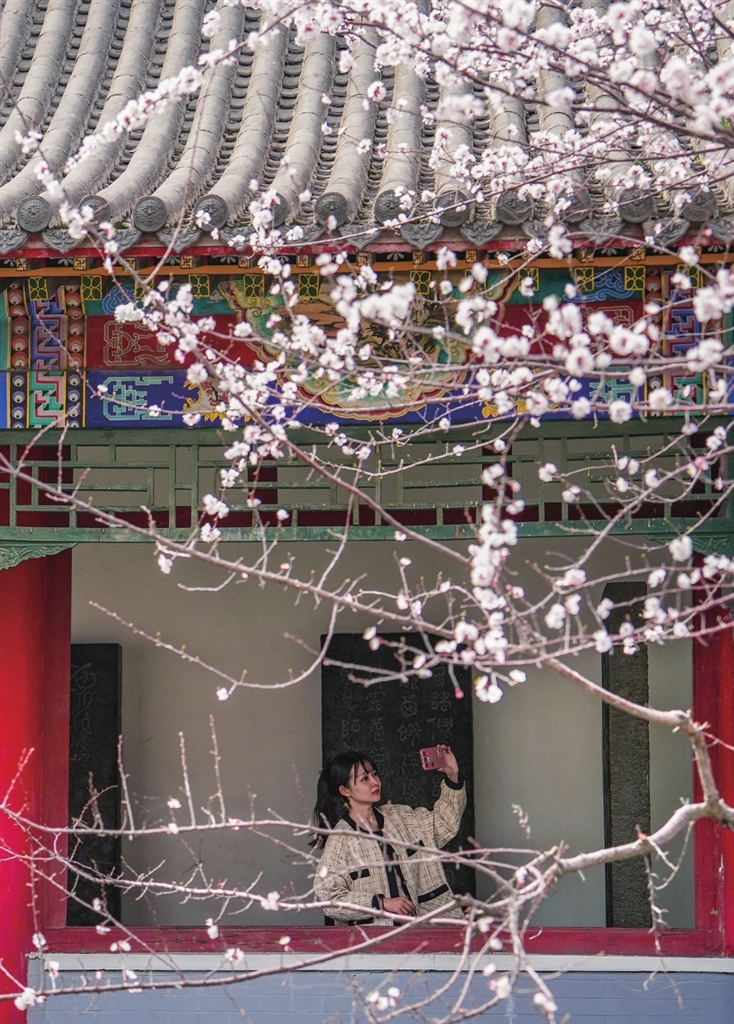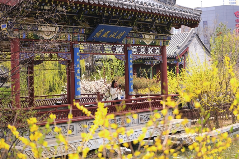 循着花香步入迎泽公园,这里的春意是热闹而明媚的。金黄的连翘如同碎金洒落,率先奏响了春的序曲;粉白的碧桃与山桃也不甘示弱,在亭台楼阁间探出头来,与古建的飞檐斗拱相映成趣。