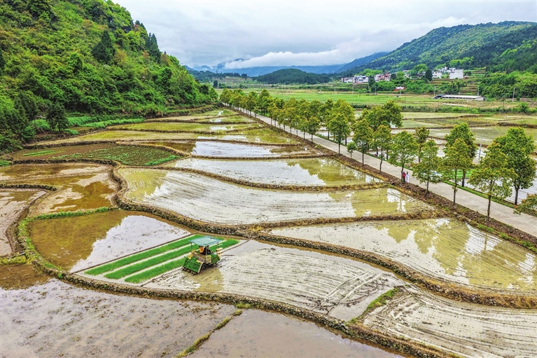 4月7日,在湖南省永州市道县乐福堂镇,农民驾驶农机在田间机插早稻(无人机照片)。