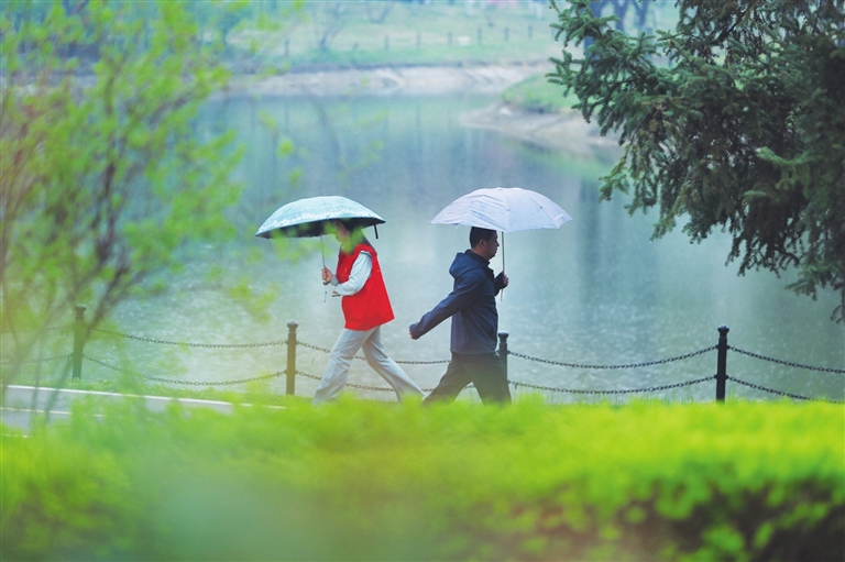 4月8日,我市迎来春雨,市民在祥云公园内撑伞漫步。王韵菲 摄
