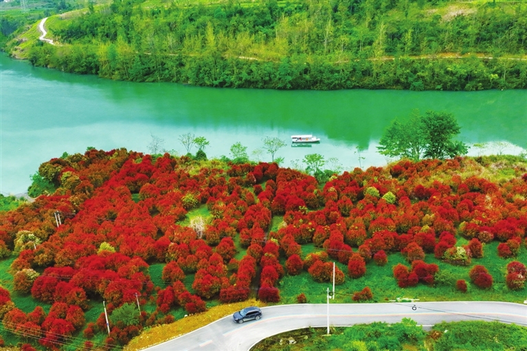 4月8日,村民乘坐过河渡船行驶在重庆市阿蓬江国家湿地公园阿蓬江上(无人机照片)。新华社发(杨 敏 摄)