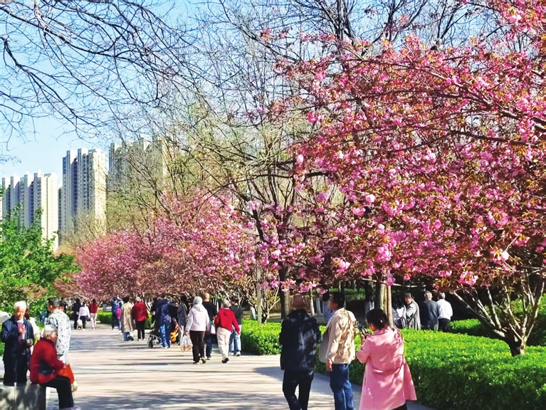 和平公园是城市西南一处具有现代感、充满运动时尚气息的大型休憩场所,草坪曲径、花木树影,错落有致、郁郁葱葱,深受游客喜爱。自2017年以来,这里每年都举办樱花活动。本届樱花文化活动周以“绚丽樱花、多彩和平”为主题,游客在欣赏樱花的同时,还可参与公园筹划的一系列文化娱乐活动。(刘晓亮 文/摄)