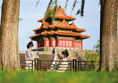 4月11日,游人在北京故宫西北角楼附近拍照。