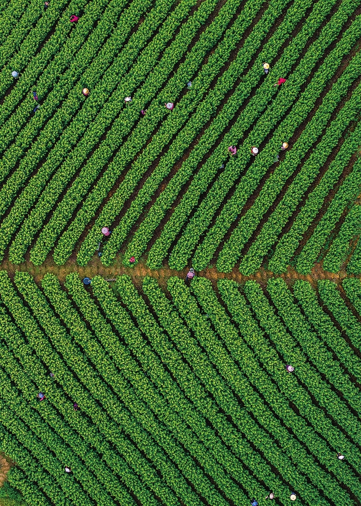4月11日,采茶工在浙江省余姚市兰江街道茶园采摘茶叶(无人机照片)。