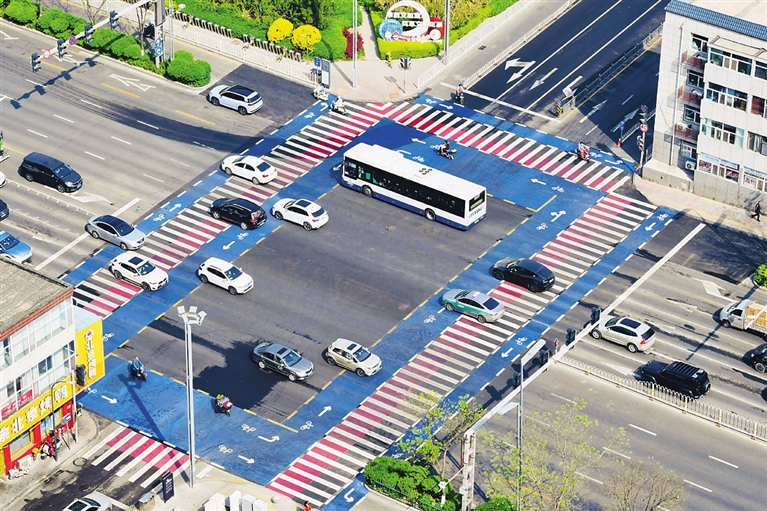 4月15日,交警部门在学府街坞城中路口增设“蓝道”斑马线,让通行更顺畅。该路口紧邻山大附中、太原三十八中等学校,早晚高峰通行压力特别大。为此,交警部门重新规划交通标识标线,蓝色区域为非机动车通行区域,过街方式更加灵活高效;对斑马线也作了上下行的区分,让行人更加安全。邓寅明 摄