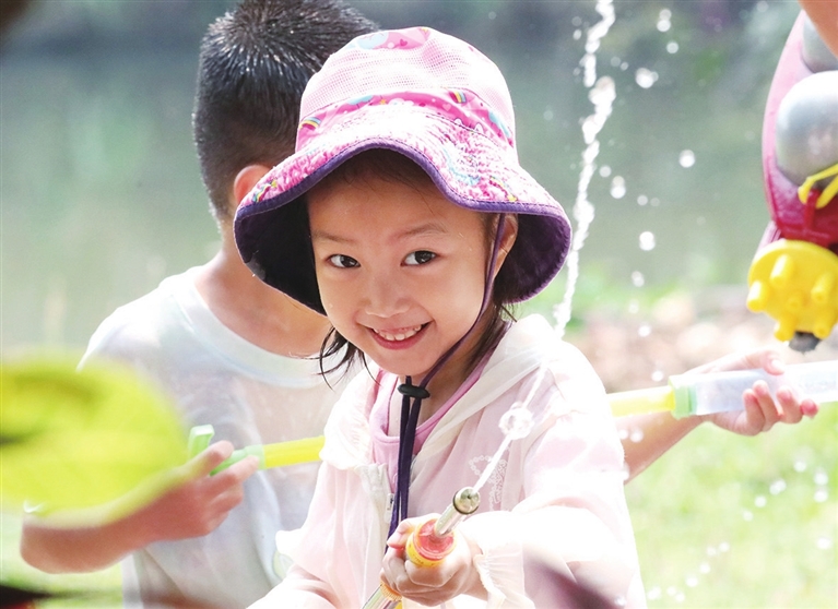 4月15日,小朋友在云南省景洪市参加泼水活动。4月15日,云南省西双版纳傣族自治州迎来一年一度的泼水狂欢活动。各族群众与八方游客齐聚景洪市泼水广场,在水花飞溅中共庆泼水节。新华社发(李云生 摄)