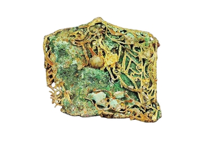 象征显赫身份的金珰。这件饰物出土于西侧室棺内人骨的头顶位置,它是墓主冠帽上的重要组件。金珰以铜牌为底,通体鎏金,整体轮廓呈尖顶、圆肩、底微内凹的样式,长约7厘米,宽约6.5厘米。其表面沁染绿锈,中央可见清晰的蝉纹,原本的镶嵌物已脱落,但周身密布的细小金粟粒依然清晰可见。据《后汉书·舆服志》记载,“侍中、中常侍加黄金珰,附蝉为文”,这种配饰是皇帝近臣与高级武官身份的象征。在太原晋墓中发现此物,直接指明了墓主人是西晋高级官僚。