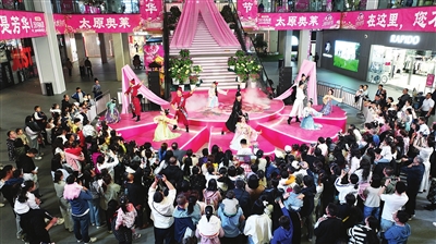 受2026年央视春晚《贺花神》节目启发,省城不少商家纷纷推出系列主题活动、主题情景剧等吸引消费者。图为4月18日太原奥特莱斯“国色芳华”主题情景舞台剧演出现场。张昊宇 摄