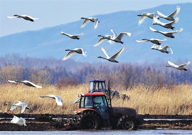 4月18日,在黑龙江省同江市的一处水田里,正在作业的农机和飞翔的天鹅相映成趣。新华社发 (刘万平 摄)