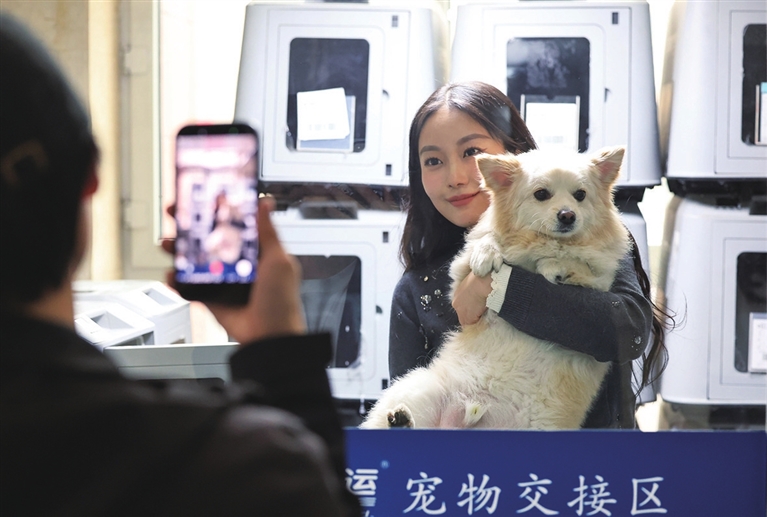4月19日,在中铁快运哈尔滨西站营业部,旅客与即将进入“智能座舱”运输箱的宠物狗合影。近期,铁路部门正式推出“爱宠行”高铁宠物托运服务,覆盖全国121座高铁车站、228趟列车。中国铁路哈尔滨局集团有限公司同步在哈尔滨、哈尔滨西、牡丹江三站开启服务,助力旅客“带宠出游”。中铁快运升级打造“智能座舱”运输箱,严格执行“隔离运输、人宠分开”,保障旅途安全舒适。新华社发