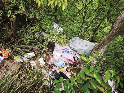那些被随意丢弃的塑料瓶、食品包装袋、易拉罐、一次性餐盒、果皮纸屑等垃圾,散落在密林草丛,卡在陡峭岩缝,甚至漂浮在水面,在漫山苍翠中格外扎眼。山顶四周,还有部分垃圾已被游客用塑料袋装好,却并未被带下山。