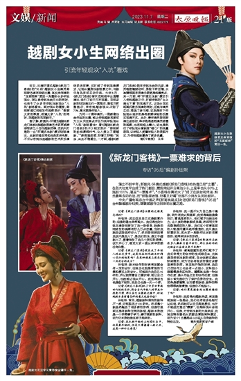近日,出演环境式越剧《新龙门客栈》的“90后”越剧女小生演员陈丽君迅速在网络出圈,其反串饰演的“玉面郎君”贾廷一角圈粉众多年轻观众,在弘扬传统戏曲文化的同时,也吸引了众多非传统戏剧观众“入坑”剧场看戏。面对观众的喜爱,陈丽君通过网络发布视频表示:“谢谢大家的厚爱,希望大家‘入坑’的同时,在越剧的坑底躺平。”据了解,新国风·环境式越剧《新龙门客栈》是越剧表演艺术家茅威涛领衔浙江小百花越剧团等,在杭州打造的一台“环境式戏剧”模式驻场演出。此剧改编自同名经典武侠电影,不仅以传统戏曲越剧的艺术形式演绎武侠故事,还打破了传统观演模式,让观众置身戏剧场景之中,与剧中角色形成互动交流。今年8月,《新龙门客栈》首次在网络平台直播演出,吸引了近千万次观看。目前该剧的驻场演出仍一票难求,据官方数据显示,非传统越剧观众占到了70%,基本都是年轻人。