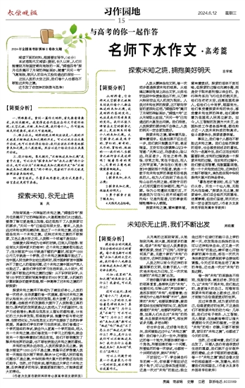 不信你翻开课本看看:郭橐驼的硕果累累,是柳宗元的“未知”,他要问问;石钟山的“声如洪钟”,是苏东坡的“未知”,他要看看;古诗词为什么格外钟情“木叶”,是林庚的“未知”,他要琢磨琢磨;爱因斯坦终生没能写完的论文,是加来道雄的“未知”,他要研究研究。试想,如果人们失去对“未知”的热情、失去探索未知的勇气,那世界该多无趣、多苍白啊!