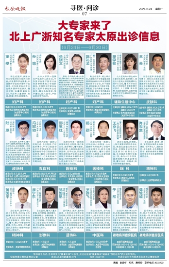 出诊时间:汾东院区:6月24、27日上午 府城院区:6月26日上午