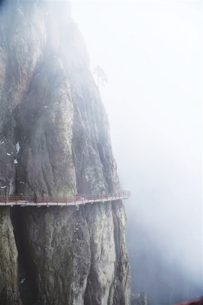 走在两山之间,一阵云雾袭来,身上如凛冽的刀削一般,雪粒摔在地上或撞击山体,发出“嚓嚓”的声响。向远处眺望,山峦隐逸在空中,朦朦胧胧,神秘莫测。只感觉云雾中的湿气一股股追逐着,冲向山体和栈道。