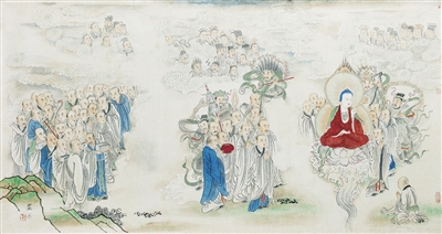 山西博物院收藏的《祇园大会图》长卷,为元末明初时寄寓江浙一带的日本僧人髪僧所作,纵37.2厘米,横1889厘米。近年来,王岩松先生对此幅作品进行二次创作,2023年10月2日在宜兴展出后,即引起关注。此作可谓王先生的倾力之作。原作描金绘于瓷青纸,尺幅亦小,王绘则领会其旨而多元纷呈,墨线勾勒又青绿设色。原作者髪僧,善画罗汉力士诸像,为一时所重。画作所绘祇园,乃印度佛教盛地,释迦牟尼得道时,曾在此说法。画面所涉者众,皆麇集于此之四方僧徒,有眉目者883人。或三五成群,结队为伴,向背顾盼,侧身转动;或百人一队,鱼贯而行,窃窃私语,大笑开怀。乘诸怪兽自天而降,手中所持,或法器,或经卷。近千人物,穿插其间,且能以心为境,以神写形。长卷中部,绘释迦牟尼说法场面。螺发高髻,额间白毫,身披袈裟,胸佩璎珞,莲座之上岸然,俨王者像。四下众僧或伫立聆听,打坐合十,或互为诘难,交流学问,周遭尚有龙凤麒麟萦绕,仙鹤猿猴传唱。人物虽夥,个性自明,活灵活现,无一雷同。