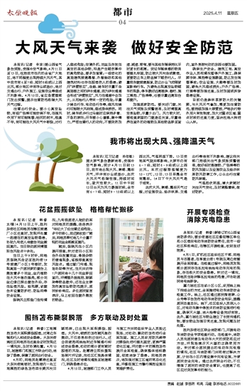 本报讯(记者 申波)据山西省气象台预报,受强冷空气影响,4月11日至13日,包括我市在内的全省广大地区,将不同程度出现持续大风天气,其中我市有6至7级、短时8级或以上西北风,部分地区伴有浮尘或扬沙,将对交通出行、户外施工、设施农业等造成不利影响。4月10日,省应急管理部门发出预警,提示注意防范极端大风天气过程。注意出行安全。要小心高空坠物,有些广告牌可能安装不牢,在强风作用下有可能倒塌;枯死的树木,根基不牢,有可能在大风天气中断裂,对行人造成危险;空调外机、花盆及存放在高空的其他杂物,均是产生砸伤事件的高危物品,要多加留意;一些老化的高层建筑玻璃幕墙、外墙瓷砖和其他建筑材料也存在脱落伤人的隐患;避开“狭管效应”,走路、骑车时尽量不走高层楼之间的狭长通道,因为狭长通道会形成“狭管效应”,风力在通道中会加大,从而给行人带来一定的危险;尽量少骑自行车、电动自行车等,侧风向骑行可能被大风刮倒,造成身体损伤。同时,骑车或步行过马路时应保持多看、不急的原则;开车要小心谨慎,集中精力,严密注意行人的动向,不要突然加速、减速、转弯,要与其他车辆保持比平时更长的距离。货运车辆装载的物资要捆扎牢固,防止被大风吹走或散落,更要防止车上物品掉下砸伤行人。尽量把车窗玻璃摇紧,防止沙尘飞进驾驶室影响行车。为避免出现高空坠物砸车的现象,停车最好远离楼房、栅栏、施工围挡、广告牌等,也要尽量远离阳台和窗户。