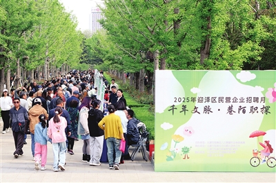 4月26日,由迎泽区人力资源和社会保障局主办的千年文脉·巷陌职探2025年迎泽区民营企业招聘会在迎泽公园举行。40余家企业提供岗位700余个,涵盖商务服务、房产经纪、科技推广、教育培训、互联网等行业领域。 张澍宏 张昊宇 摄影报道