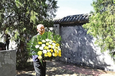 赵体均老人神情庄重肃穆,手捧鲜花缓步走向烈士墓前。