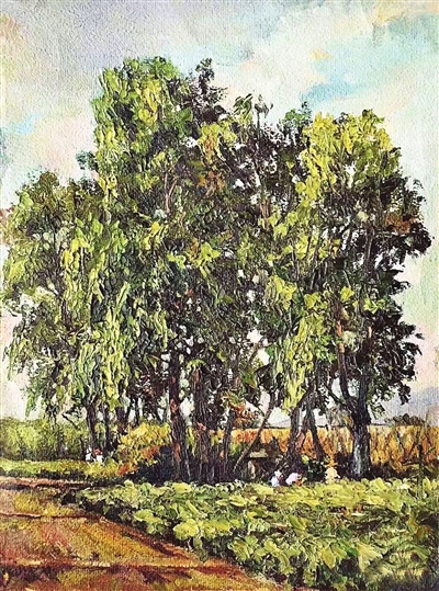 回到太原后,父亲将对油画刀技法的钻研倾注于《水西门外》的创作。他执刀作画,让颜料在画布上堆叠、刮擦,每一道刀痕都迸发出独特的艺术生命力。画面中,高大树木枝叶繁茂,深浅不一的绿色通过刀刻般的笔触层层铺展,仿佛能触摸到叶片脉络与光影跃动;树下田野以厚重颜料堆砌出蓬勃生机,泛黄土地与翠绿植被在刀痕起伏间交织自然韵律。小路蜿蜒延伸向远方,藏着岁月故事,田间劳作的人物虽寥寥数笔,却为田园图景注入鲜活生活气息。他以油画刀为媒介,不仅定格水西门外树木葱茏、田野广袤的质朴风光,更将苏联油画写实技法与本土田园的诗意氛围巧妙融合,在画布上谱写一曲关于自然与艺术的赞歌。