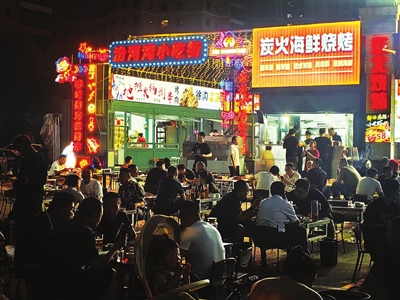 夜幕降临,街头的烟火气与热浪一起升腾,市内多处烧烤摊前食客如云。铁烤架上“滋滋”冒油的羊肉串,红彤彤的小龙虾与冰镇啤酒堪称绝配,构成一道独特的夏日风景。