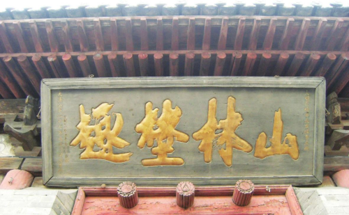 明崇祯年间,傅山先生应邀来灵石县两渡镇双藤书院讲学,其间游览名胜资寿寺,乘兴挥毫题写“山林埜趣”四个大字。“埜”,为“野”的异体字。该匾额现悬挂在寺内天王殿前,匾额中间为傅山真迹“山林埜趣”,后人在匾额右侧题款“大明崇祯年太原傅青主题”,左侧题款“大清道光二十七年夏五月合里重修/民国十二年弟子×重修”。傅山先生所书“山林埜趣”四字木刻而成,黑底金字,字体饱满雄健,笔力遒劲,仿若铜浇铁铸,气宇轩昂。