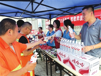 本报讯(记者 李涛 文/摄)“快来吃口瓜,歇一下吧。”高温天气,给户外劳动者带来了严峻“烤”验。7月15日,和泽苑社区、山西顺丰工会联合开展送清凉活动,在爱心驿站为快递员、外卖员、环卫工和网约车司机等群体发放解暑降温用品。上午,位于千峰北路与后北屯街交叉口的爱心驿站前,设立了“清凉补给点”。社区工作人员、快递小哥热情招呼着过往的户外劳动者,过来领瓶水或吃口瓜,让大家一解暑气。“谢谢!”一名外卖小哥路过这里,接过一瓶矿泉水,大口喝起来。喝完,他不忘给同事发了个定位,告知其送餐路过也可以在此歇一歇。