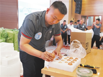 小杜入职已有3年,常会寄送像玻璃材质等易碎的物品,“包装要格外注意防震,箱子一定要填满,用一些气泡膜和泡沫板填充,外包装也要贴好易碎标志。”他表示,打包要快,更要细心,分拣、派送都要轻拿轻放。他2分钟完成一盒生鸡蛋的打包,裁判让包裹从1米的高处落地。开箱清点,均未摔破。山西顺丰负责人表示,会定期举办这样的比赛,让快递小哥切磋技艺,提升服务水平。