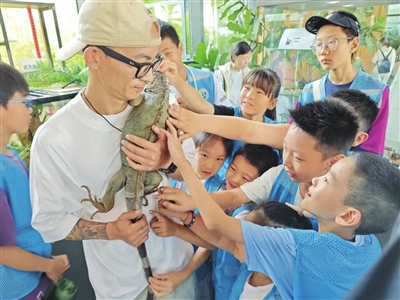 本报讯(记者 刘晓亮 文/摄)夏日炎炎,荷花飘香。这个暑假,太原植物园七大主题夏令营活动吸引了近千名中小学生参加,自然、艺术、科学与好奇、惊喜、冒险相互碰撞,学知识、掌握生存技能与交朋友、加强团队合作相互融合,一段段有趣味、有意义的奇幻冒险之旅深深打动了孩子们。暑假期间,太原植物园邀请专业科普老师授课,为孩子们精心设计了七大主题夏令营,包括萌宠C位,机甲狂潮、微观奇遇、萤光梦境、星河探秘、艺术工坊、横行之王等,各有奇趣。萌宠C位,让孩子们零距离接触无毒无害的蜥蜴、壁虎、蟒蛇等,战战兢兢之中又满是紧张兴奋;萤光梦境,带领孩子们夜游萤火虫馆,探索萤火虫发光的奥秘。许下“星语星愿”;星河探秘,亲手操控天体箱,如同获得时空之眼,仰望浩渺天空,捕捉宇宙神秘……