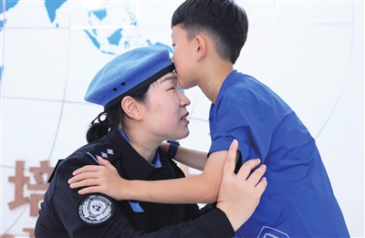 8月5日,在出征仪式结束后,中国第十一支赴联合国南苏丹任务区维和警队队员张地与孩子告别。当日,中国第十一支赴联合国南苏丹任务区维和警队出征仪式在中国人民警察大学维和警察培训中心举行。6日凌晨,17名中国维和警察将乘机赴南苏丹执行维和任务。