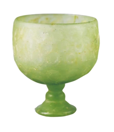 这件玻璃杯,如玉般温润。浑身透出绿色荧芒,轻薄而透亮。大而圆的腹,小而深绿的类似青铜豆的足。杯壁有五排磨花圆连在一起作装饰。比起现代的玻璃更有质感。真不敢相信,这玉似的杯,已经1442岁了。