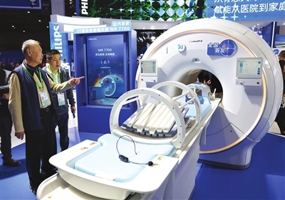 下图:11月6日,参观者在进博会医疗器械及医药保健展区飞利浦展台了解MR7700多核磁共振设备。这是该产品在中国首发。