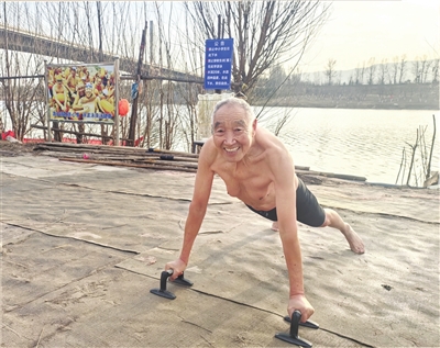 12月1日,户外温度达到零下2.4摄氏度,记者跟随冯德升来到位于金滩大桥附近的罗汉营冬泳基地,简单热身活动筋骨后,他便缓缓入水,四肢协调舒展,像一条灵活的鱼在水中游动,水面上划出一圈圈涟漪。一两分钟后,他迅速上岸,立刻做俯卧撑、仰卧起坐等,用运动产生的热量驱散寒气。