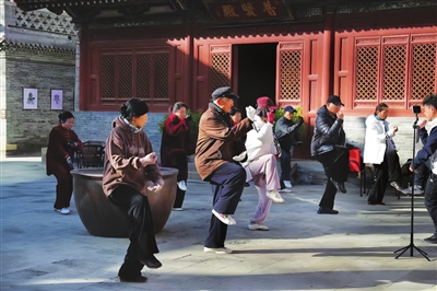 12月25日,文殊寺内许多中老年人练习太极拳。专家提醒,寒冬时节,动作舒缓的传统养生运动更适合中老年人。 王韵菲 摄