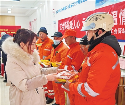 同日上午,辖区环卫工、保洁员和保安来到范家堡社区爱心驿站领取爱心汤圆。同时,社区工作人员和志愿者带着爱心汤圆,走进辖区外卖站点、快递网点,将这份满载祝福与关怀的甜蜜送到大伙手中。