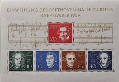 德国1959年发行的贝多芬音乐厅落成纪念小全张邮票