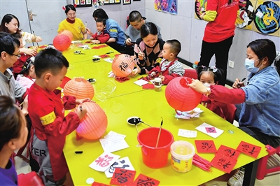 2021年1月1日,小朋友和家长在太原市一家商场内参加以制作灯笼为主题的亲子活动。