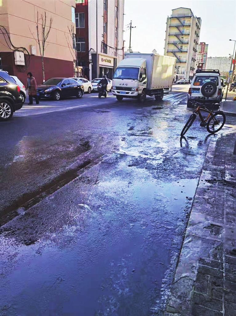 姜先生反映,8日一早,他骑车由北向南经过南海街旧城街口,多半幅路面结了一层冰,非常湿滑。接到反映后,记者去到南海街了解情况。在旧城街口以北约30米处,路面确实有大片结冰带,车辆及路人通过时无不放慢速度。对此,记者向附近住户了解到了大概情况。原来,结冰源于附近商户的一场火灾。