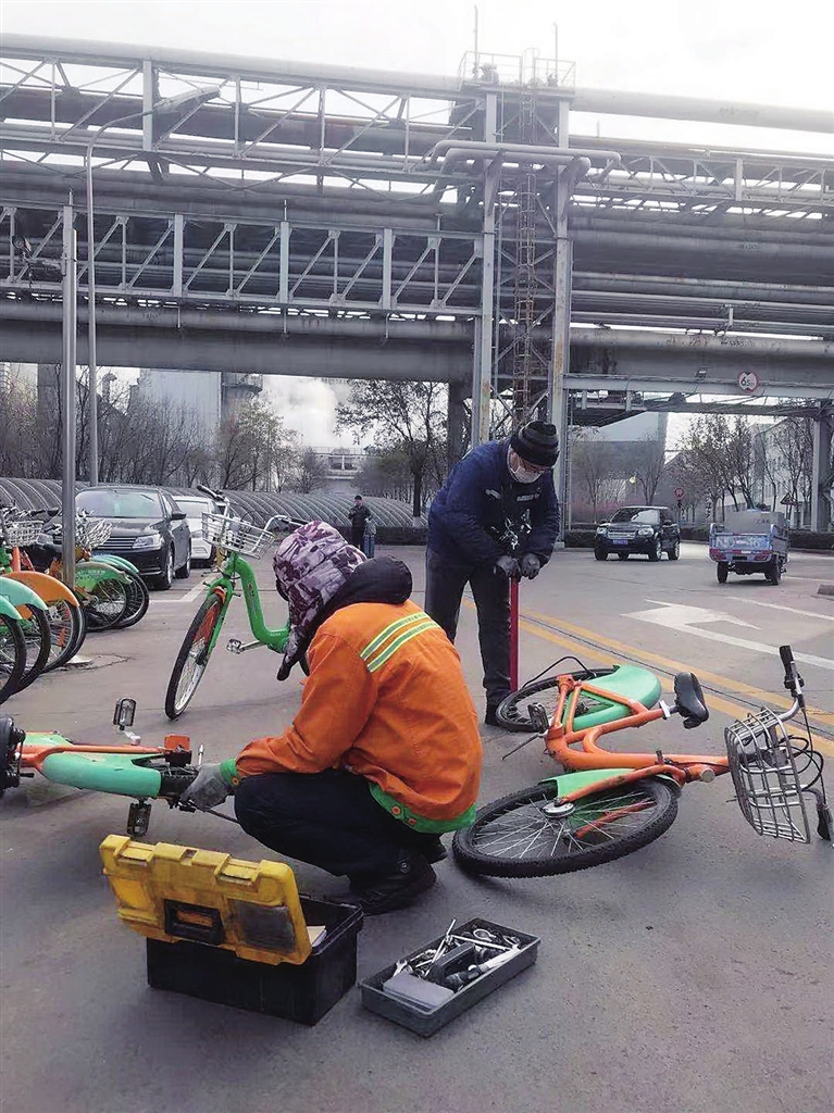 1月9日上午,记者在太钢厂区内的一个公共自行车服务点看到,3名修理工正在保养公共自行车。只见一名修理工慢慢地将公共自行车“倒立”,轻轻地放在维修垫上,接着逐一检查保养了刹车、座位、轮胎、脚蹬等零部件,及时更换了老化和破损的配件,并还仔细检测了车架的整体稳定性。一辆公共自行车保养完了,修理工还会试骑一段距离,以确保车况完好。最后,网管员将保养好的公共自行车清洗干净,才会上架恢复使用。