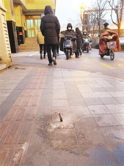 当日上午,记者到现场看到,这截钢筋有拇指粗细,长十几厘米,位于便道正中央。由于钢筋不太显眼,稍不留神就可能被绊倒。记者观察发现,这截钢筋其实是用来固定阻车桩的,只是阻车桩不见了踪影,只留下了钢筋孤零零地立着。