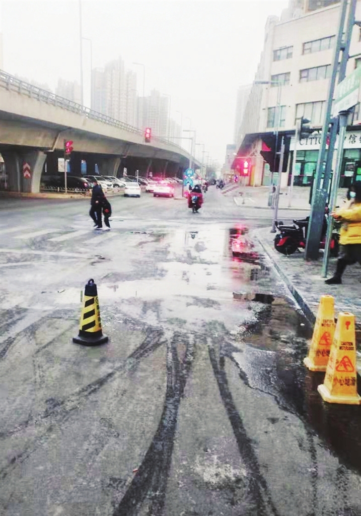 1月8日中午,金刚堰路与北大街交叉口,一家快捷酒店的太阳能热水器被冻裂,导致附近路段积水结冰。本报曾对此事进行了报道。1月12日,相似的情况又出现在建设路太堡街口,路口东南角的非机动车道和人行便道上积水严重,早晨低温环境中,水很快成冰,路人骑车经过时很不方便。记者实地查看,漏水点在楼上,向附近商户了解,得到的消息是,应该是楼顶的太阳能热水器受冻,导致漏水,具体是谁家的,尚无法确定。