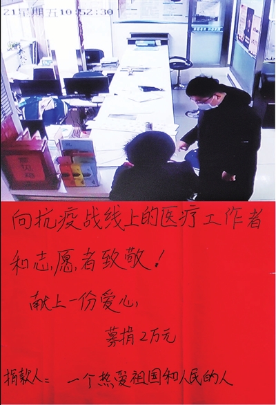 “你们太辛苦了!我年纪大了帮不上什么忙,捐两万元钱……”三言两语,还没等工作人员回过神来,大婶就匆匆离开了。
