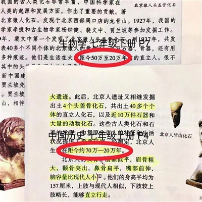 施女士还告诉北青报记者,她家孩子在人大附中读初一。上述人教版历史书正是孩子这学期正在学习的课本。“七年级下册《生物学》则是我同事孩子用过的旧书,借给我家孩子提前预习下学期的课程。他阅读时很仔细,发现了这《生物学》上的北京猿人生活时间竟然跟他已学习过的历史书上的北京猿人生活时间不一样。他很惊讶,就来问我到底以哪个版本为准?”
