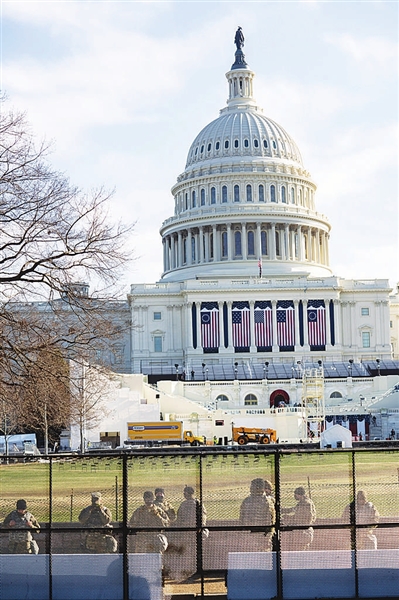 国会大厦是安保的重中之重。大厦外围已竖起至少两层2米多高的黑色金属防攀爬栅栏。里层栅栏后面是全副武装的国民警卫队队员,每隔几米就是一个岗位。大厦内也提升了安保级别,进入大厦需通过层层关卡,众议院议事厅入口还新安装了金属探测器。