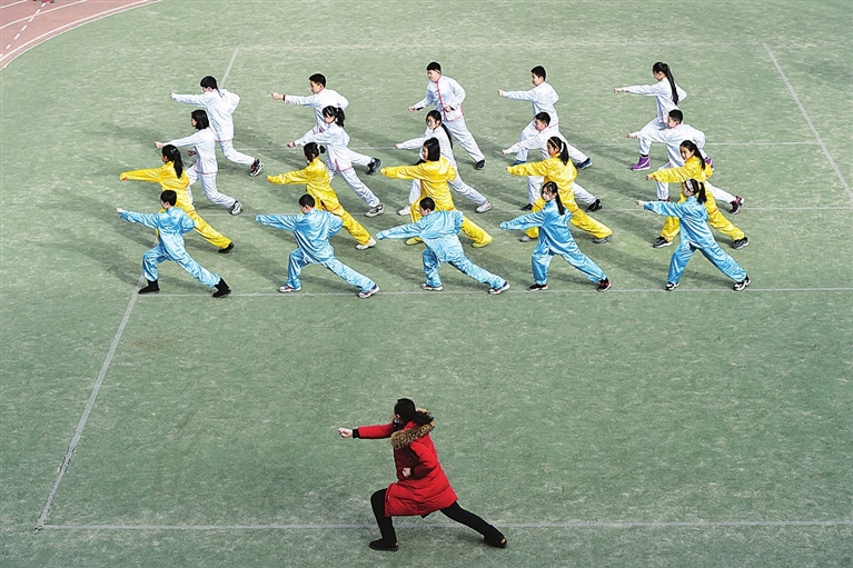 1月14日,校尉营小学的同学们正在跟着老师练习武术操。该校专门为不同年龄段的孩子设计了两套国学武术操,以提高孩子们对体育运动的兴趣,以感受武术的魅力。 全媒体记者 柴杰梁 摄