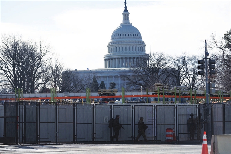 白宫和国会大厦戒备森严,国家广场周围路段几乎全线车辆限行,全副武装的国民警卫队队员、安保人员和重型军用车辆层层把守,重点区域和重点建筑周围竖起围栏……这是记者在华盛顿特区看到的景象。法新社用伊拉克首都巴格达“绿区”来类比此刻的美国首都。