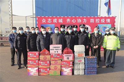 连日来,社会各界纷纷献爱心,向坚守在疫情防控一线的民警捐赠水果、方便面、矿泉水、酒精、口罩等物资。图为一家爱心企业给在高速口执勤的清徐县公安局民警送去慰问品。