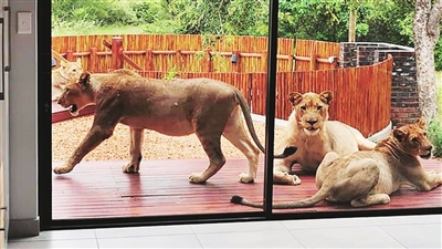 大卫·戴·比尔和妻子玛丽丝卡推开房门看到,一群狮子正懒洋洋地躺在露台地板上。关门声还吓了狮子一跳,它们从地上惊起,转而在院中悠闲踱步,最后才慢慢离开。